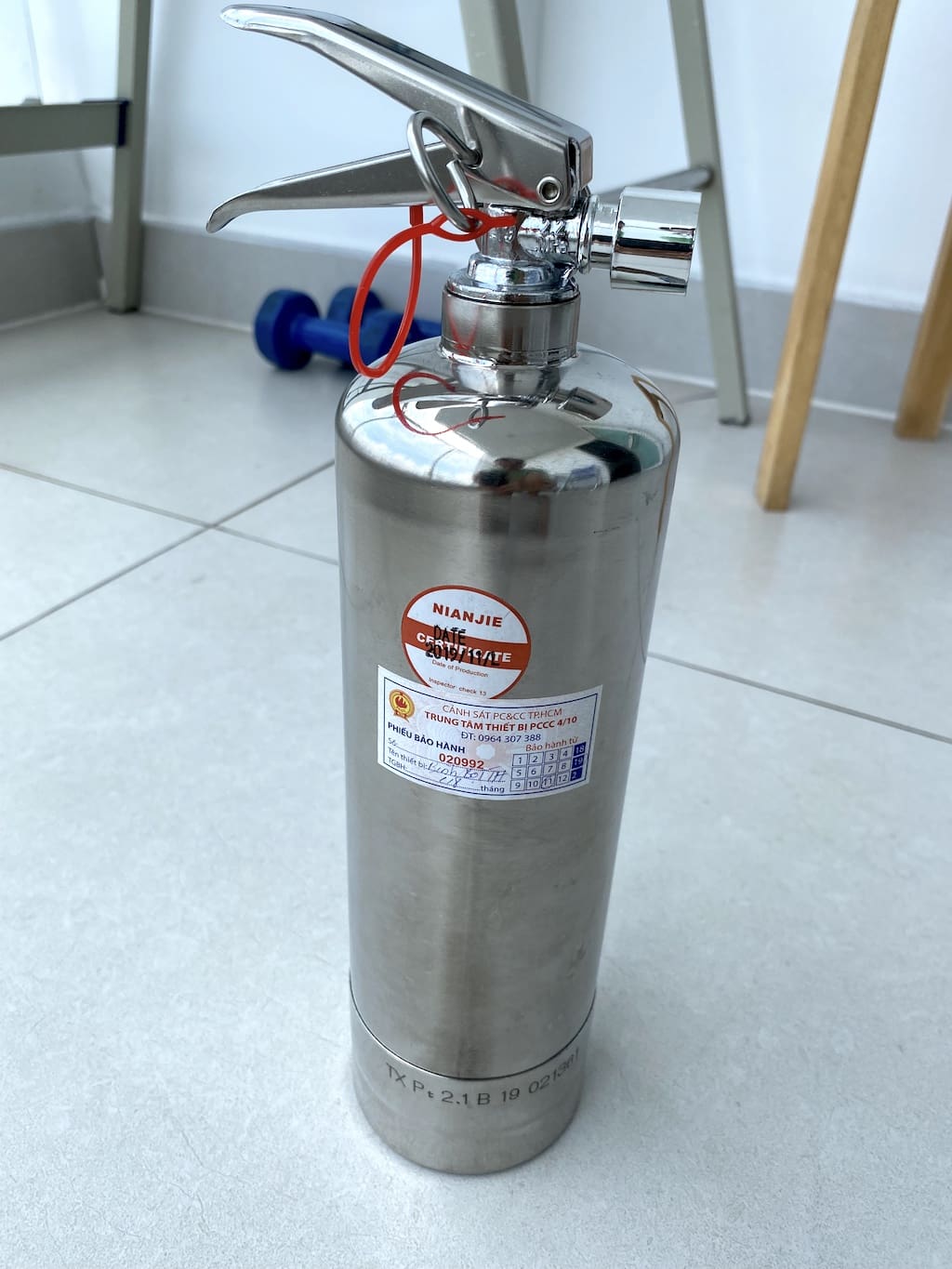 Giờ mới đúng là nội dung chính, là cái bình chữa cháy, đây là bình chữa cháy mini xài ở gia đình, và công nghệ hiện đại nữa chứ không phải như mấy cái bình to tướng màu đỏ. Nó gần đơn giản như chơi súng phung nước, có thể xịt xa 5m-7m bằng một thứ chất lỏng an toàn, không mùi, có thể dễ dàng lau sạch. Cái bình này vỏ inox rất đẹp, nặng 1.6kg, xuất xứ Đài Loan, tôi mua từ một anh cảnh sát PCCC trong một buổi tập huấn PCCC ở công ty từ 3 năm trước. Mỗi nhà rất nên có một bình, theo tem dán trên bình thì địa chỉ cần tới là trụ sở PCCC ở đường Trần Hưng Đạo.