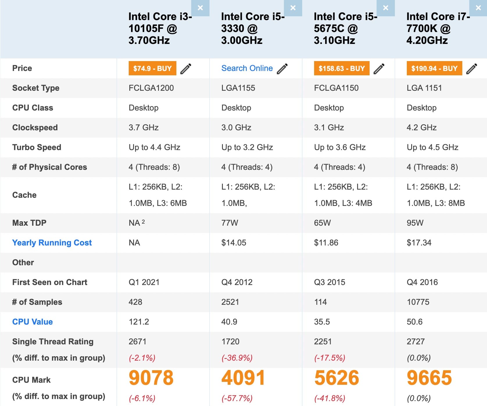 Sau khi so sánh sức mạnh của các CPU này thì ta có kết quả như dưới đây, thật tuyệt :). Các con số sẽ cho câu trả lời chính xác nhất (xem bảng so sánh CPU).