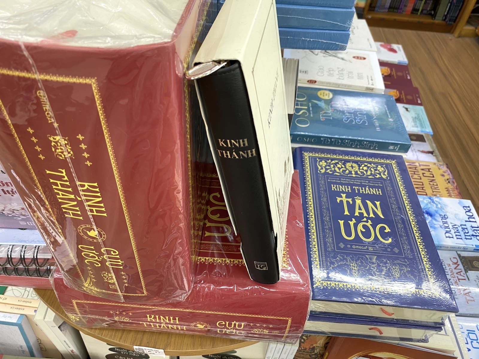 Trở lại tại sao hai bản in Kinh Thánh của Alpha Books lại khổng lồ tới như vậy, chắc chỉ có là in chữ to như con gà mái, có lẽ vì sẽ phải để ở trên một cái bàn khá xa mắt chứ to thế kia đọc được đôi trang chắc mỏi tay luôn 😂. Tôi không thể ngó thử vào trong vì quyển nào cũng bọc nylon kín và xui là chưa có ai đủ tò mò mà lén bóc nylon ra cả. Mà cũng không dám bóc thật vì giá nó trên trời, quyển xanh đâu đã 600K, bóc ra mà bị bắt đền chắc chết 😂. Alpha Books rất hay làm sách khủng bố, giá cao ngất rồi ế dài, sale 50% vẫn ế, đôi lúc tôi tự hỏi không lẽ họ rửa tiền 😂 (hay là muốn vào kỷ lục Guinness?).