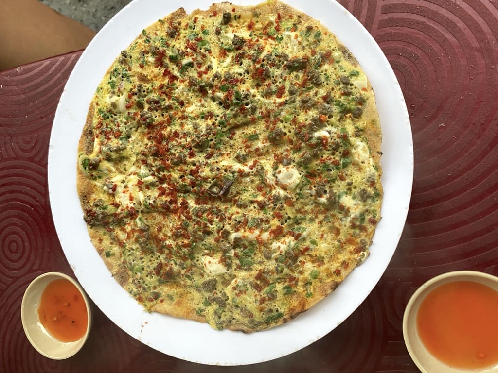 Bạn Gấu cứ lèo nhèo đòi ăn bánh mỳ xíu mại nên tìm mãi mới ra một tiệm trên đường Trần Nhật Duật, bánh mỳ ăn kèm một bát xíu mại chứ không phải cho viên xíu mại vào trong bánh. Đây là món ăn sáng phổ biến ở Đà Lạt nên rất ít tiệm còn bán buổi chiều. Thêm một ly sữa đậu nành nóng là đúng điệu Đà Lạt trong một chiều mưa. Ăn xong thì ghé vào tiệm bánh tráng nướng bên cạnh, ngon và rẻ giá menu cao nhất cũng chỉ 22K (gần nhà tôi có một tiệm cũng từ Đà Lạt xuống giá loanh quanh từ 30K-50K, đúng SG cái gì cũng đắt đỏ). Tiệm này có vẻ có tiếng, ô tô cũng ghé mua liên tục.